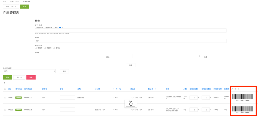 ②検索結果のバーコードを確認する
