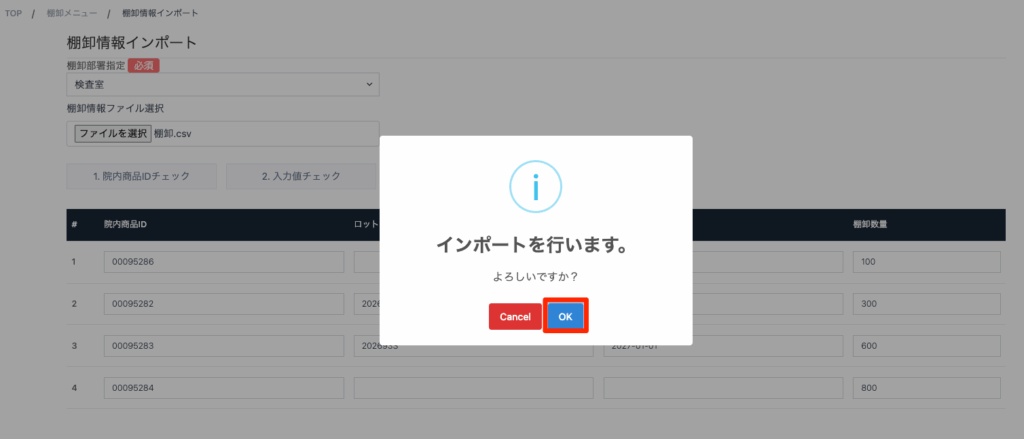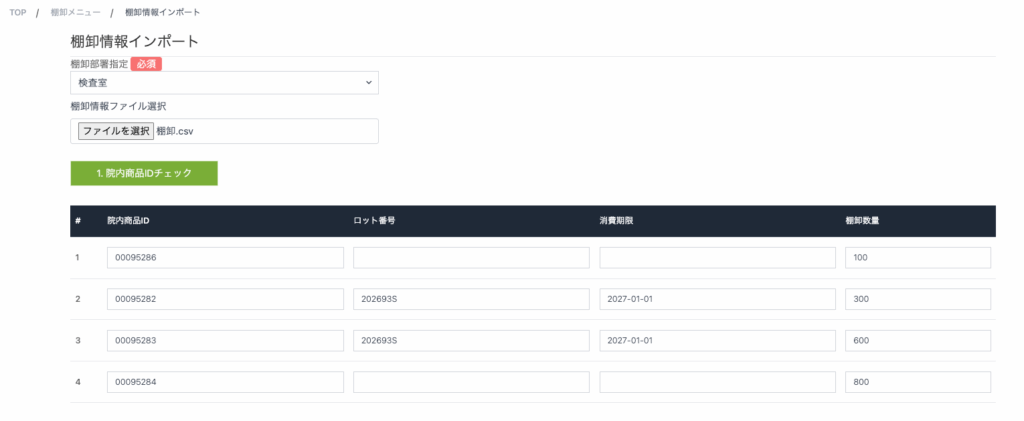 あらかじめ院内商品一覧マスタをダウンロードしてExcel等に部署ごとの棚卸データをcsvファイルで作成・保存し、その棚卸情報を一括でインポートすることで大量の棚卸データをシステムへ一時保存することが可能です。