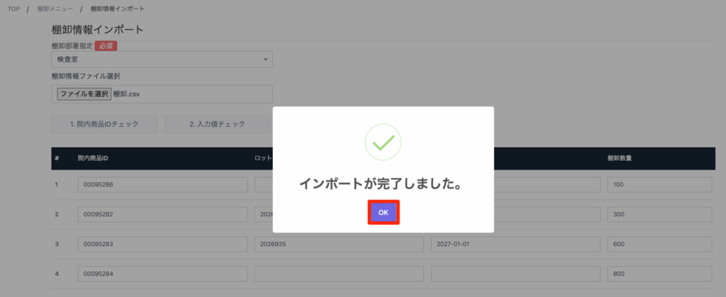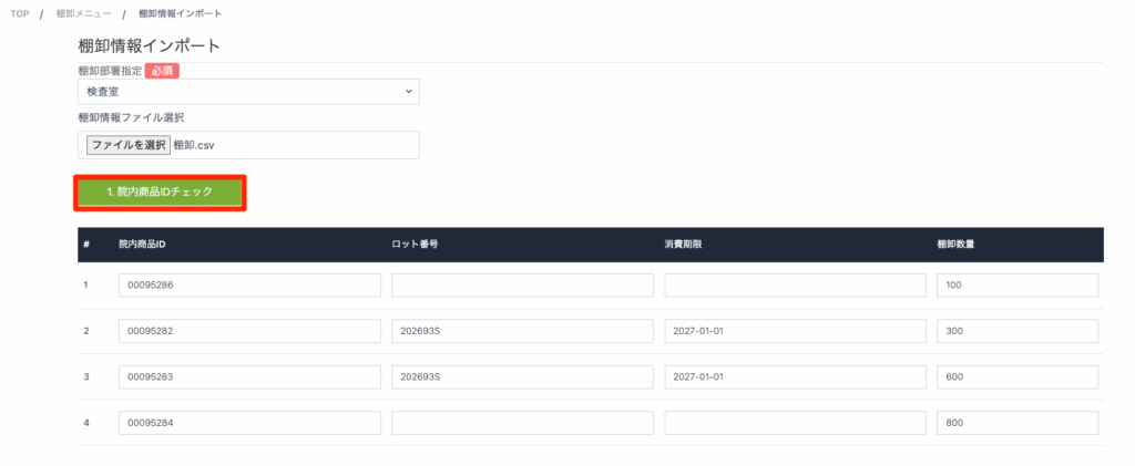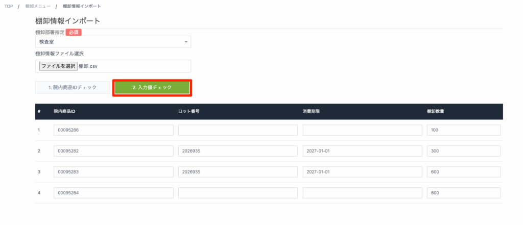 部署ごとに作成した棚卸データを一括でインポートし、棚卸情報を作成する際に利用する機能です。